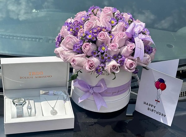 Fragrant lavender and elegant roses for a serene touch matched wiwe a luxury watch set.